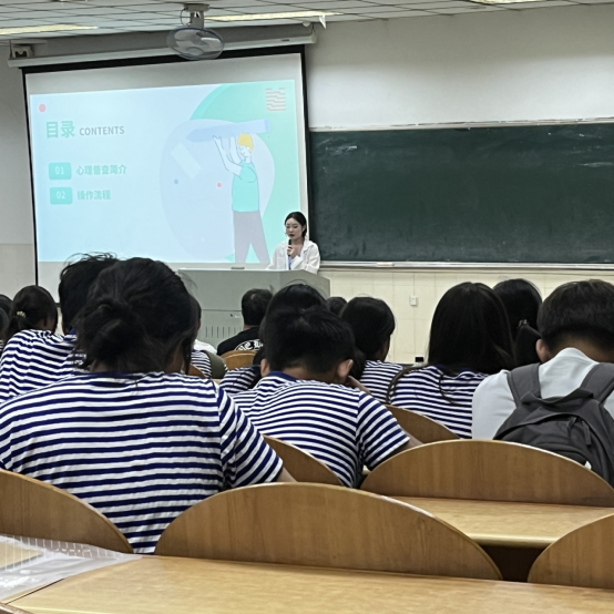 于9月18日晚在阶梯教室103举行2023级新生心理普查宣讲活动。会议由学院心理协会会长胡贞雅主持。