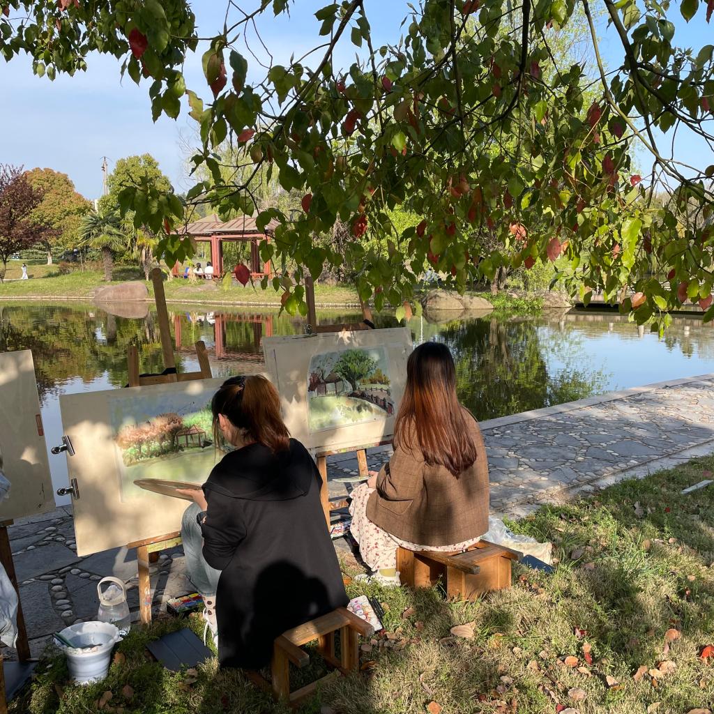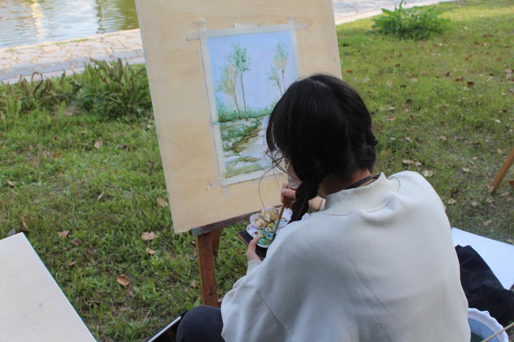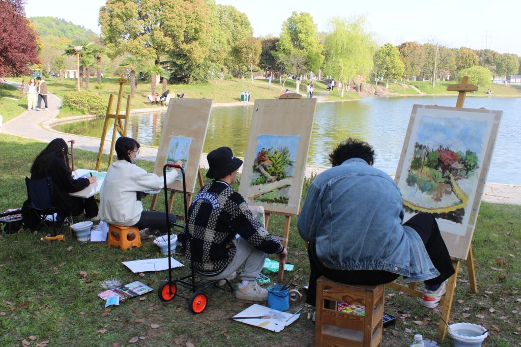 春意浓郁,艺设学子们以班级为单位组成小组,在荟灵湖和图书馆周边沐着春日,迎着春风,背着画板,拿起画笔,蘸着颜料,将工大春色描绘在画纸上,用自己的画笔留住工大的春天。在活动期间,各年级辅导员多次前往写生现场对学生进行指导和陪伴,与同学们一起描摹春意,记录春天。