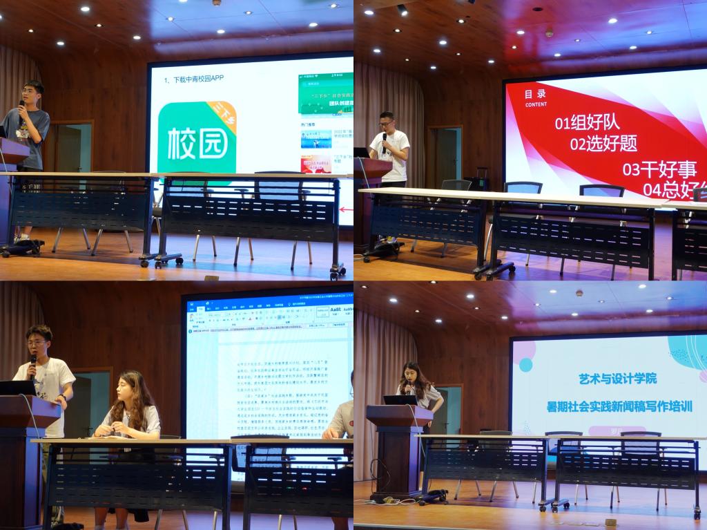 2022年暑期社会实践组队情况,本次社会实践围绕“党史学习与理论宣讲”、“新时代文明与国情观察”、“乡村振兴与文化惠民”、“返家乡”等4个方面采取学院组队与班级个人自由组队等形式共组建了42支队伍,截止目前已获批1支国家级重点团队。2021年暑期社会实践校先进个人赵富成同学分享暑期社会实践宣传报道经验,他从“组好队、选好题、干好事、总好结”四个方面分享了他的社会实践经验,并以实际案例分析他的投稿经验。学院学生会前主席张辉同学分享了暑期社会实践宣传经验,他从细微处分享宣传报道应当注意的地方,如何提高投稿通过率。随后,2021级辅导员罗凡做了暑期社会实践宣传报道培训,她从新闻的基本概念、新闻的写作结构、具体案例分析三个部分,详细讲解如何写好一篇暑期社会实践新闻报道的标题、导语、主体和结尾。