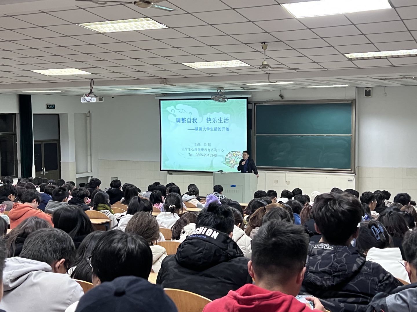 讲座上,俞超老师以“调整自我,快乐生活”为主题,从“情绪调控、集体生活、学习与成长、自我认识”四个方面对大学生活展开论述。俞超老师首先从自己的大学生活谈起,通过讲述大学的成长与学习经历,提醒同学们要接受理想与现实的落差,保持乐观积极向上的心态,热爱生活,珍爱生命;其次,结合校园真实案例,就新生同学如何调解自身情绪、适应大学生活提出科学、合理的建议;再次,他鼓励同学们学会调节好自己的情绪,建立良好的人际关系,学会接受爱和给予爱,同时要广泛培养兴趣爱好,创新性地学习,把握好当下,规划好未来。最后,俞老师介绍了校心理健康教育中心相关资源,帮助学生更好地理解心理咨询,提高积极寻求心理援助的意识。讲座涵盖了新生适应、人生规划、心理预期等多个方面,对大一新生容易出现的问题进行了分析和引导,现场氛围轻松愉快,同学们认真聆听,获益匪浅。