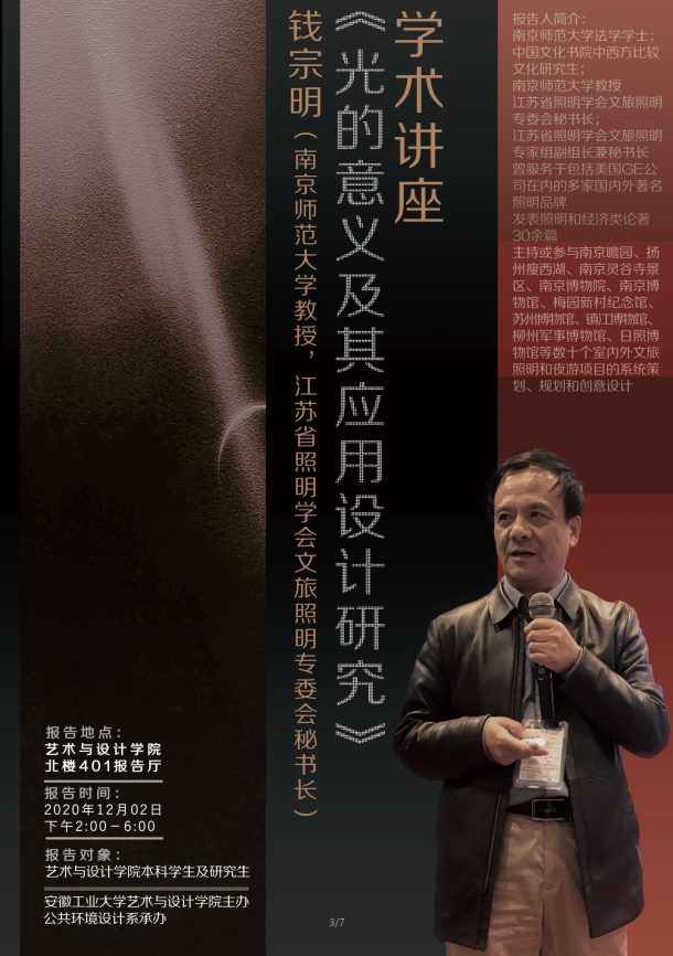 邀请,南京师范大学教授、江苏省照明学会文旅照明专委会秘书长钱宗明老师在教创楼北401为大家作了两场的学术报告,报告会由宋益民老师主持。