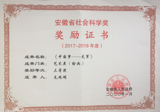 近日,安徽省政府发布2017—2018年度安徽省社会科学奖获奖成果名单,a动漫 教师毛珠明绘画作品《中国梦——天军》荣获艺术类三等奖,实现了a动漫 科研成果省部级政府奖项的突破。a动漫 近年来以艺术学科建设为引领,以高水平科研项目和重大主题性艺术创作为具体抓手,重点扶持一批高质量论文、学术著作、艺术作品等各类社科类成果,着力提升学院全方面应用型科研创作水平。