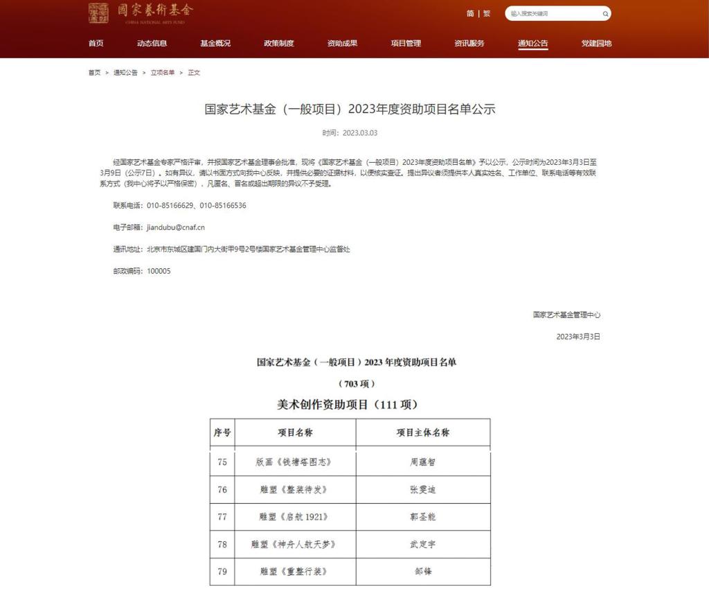 近日,国家艺术基金管理中心公示了国家艺术基金(一般项目)2023年度资助项目名单,我院郭圣能老师申报的美术创作项目:雕塑《启航1921》获得立项。这是郭圣能老师继2018年获批国家艺术基金青年艺术创作人才项目雕塑《徽骆驼》后,获批的又一项国家艺术基金项目。