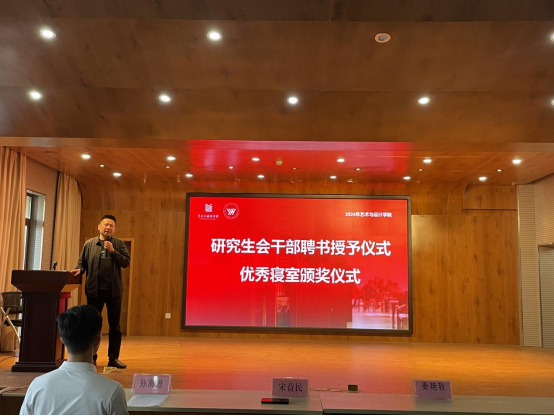 大会首先举行了新一届研会干部的聘用面试环节,参选人员由学院严格把关,辅导员与本届研会部门负责人及学生代表共同评审,选拔产生了新一届研会各部门负责人。在接下来的研究生会干部聘书授予仪式暨优秀寝室颁奖仪式上,副院长宋益民发表讲话,对研会工作表示肯定,并对新一届研会提出了要求与期望,他强调,研会工作要以“自我教育、自我管理、自我服务、自我监督”为宗旨,立足于a动漫