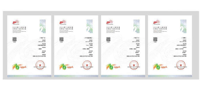 李林森指导,谢琳轩创作的作品《中国红联通中国结》获平面类国赛二等奖,由栗宗爱指导,黄孝楠、蔺楷轩创作的作品《Fenix·元素使》获IP与创意周边类国赛二等奖,由陶奕如指导,黄孝楠、范茹炘创作的作品《创界X》获平面类全国二等奖,由张浩霆指导,蒋祝杰、杜尹怀誉创作的作品《沃沃沃~快乐沃派来了》获广播类全国二等奖。