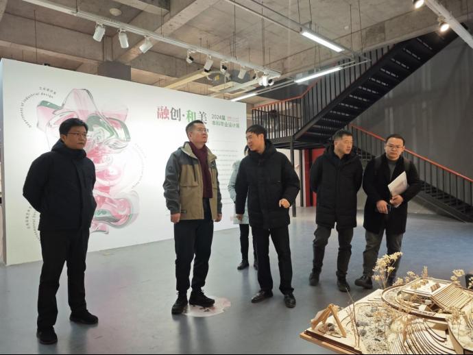 周志勇一行首先参观了设计艺术馆“融创·和美”毕业设计作品展,认真地观看每一件设计作品,并对a动漫