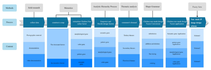 研究团队通过整理池州滩文化文献,结合模因理论提取文化因子,构建了池州面具文化的基因图谱。他们采用层次分析法客观赋权各设计因子,进行因子重要度排序,并通过文本主题分析法分析消费者需求。最终,利用形状文法创作符合当代审美的设计产品,并运用模糊综合评价方法对设计方案进行评估,选出最优方案。这一新型集成方法为传统文化产品的设计提供了更高的客观性和合理性。
