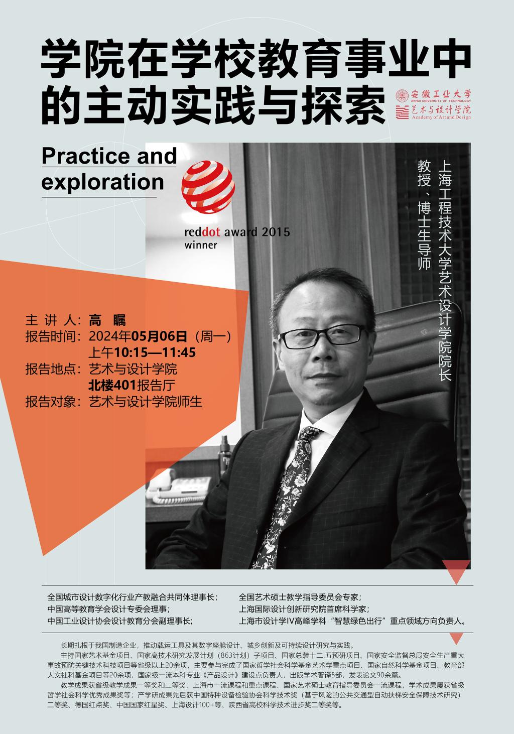 高 瞩,教授、博士,上海工程技术大学艺术设计学院院长,博士生导师,全国艺术硕士教学指导委员会专家,上海国际设计创新研究院首席科学家、上海市设计学IV高峰学科“智慧绿色出行”重点领域方向负责人、全国城市设计数字化行业产教融合共同体理事长,中国高等教育学会设计专委会理事、中国工业设计协会设计教育分会副理事长。长期扎根于我国制造企业,推动载运工具及其数字座舱设计、城乡创新及可持续设计研究与实践。主持国家艺术基金项目、国家高技术研究发展计划(863计划)子项目、国家总装十二.五预研项目、国家安全监督总局安全生产重大事故预防关键技术科技项目等省级以上20余项,主要参与完成了国家哲学社会科学基金艺术学重点项目、国家自然科学基金项目、教育部人文社科基金项目等20余项,国家级一流本科专业《产品设计》建设点负责人,出版学术著译5部,发表论文 90余篇。教学成果获省级教学成果一等奖和二等奖,上海市一流课程和重点课程、国家艺术硕士教育指导委员会一流课程:学术成果屡获省级哲学社会科学优秀成果奖等:产学研成果先后获中国特种设备检验协会科学技术奖(基于风险的公共交通型自动扶梯安全保障技术研究)二等奖、德国红点奖、中国国家红星奖、上海设计100+等、陕西省高校科学技术进步奖二等奖。