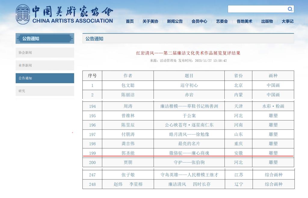 11月27日,由中国美术家协会、重庆市纪委监委、重庆市文学艺术界联合会、重庆高新区党工委及四川美术学院联合主办的“红岩清风——第二届廉洁文化美术作品展览”复评结果揭晓,我校教师郭圣能的雕塑作品《徽骆驼——廉心商魂》成功入选,为学院党建与艺术创作融合再添佳绩。