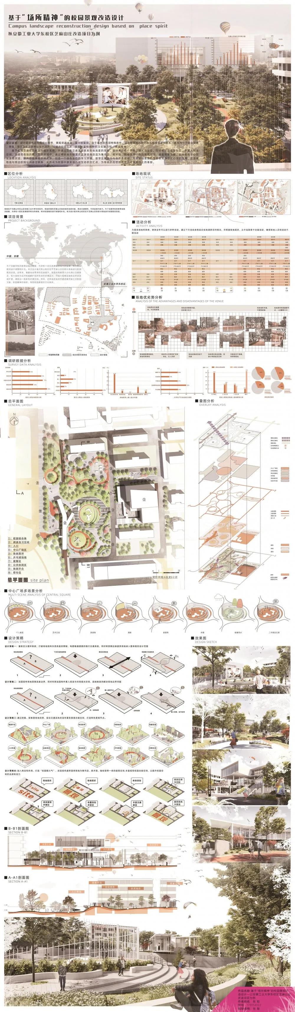 设计说明:设计场地地处校园核心地带,地形层次丰富,且周边人流量较大、交通便利,可达性较强。由于场地的各项特殊条件,设计使场地与各功能区域建立多向联系,并成为一个融合交通、景观、学习及交往多种功能的场所,以提升校园品质,体现出高校独特的文化魅力和“场所精神”。
