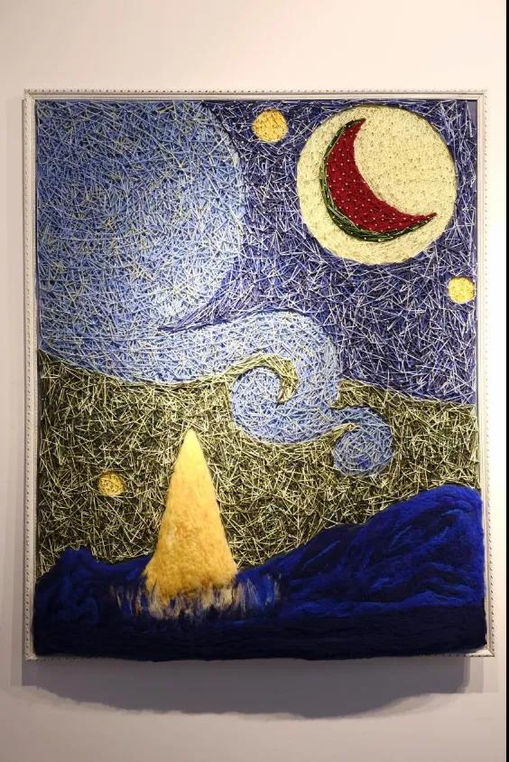 设计说明:一百个人看星空,眼里会有一百个不同的星空。作品中,在一个有无数遐想的夜晚里,有那么一个人,坐在山野间,点燃一束篝火,眺望着天空中的繁星。呀,那弯弯的月亮怎么会有点像可口多汁的西瓜呢。想着想着,现在遍一阵吃瓜心切。走了,找西瓜去了。留下山野间那熊熊燃烧的篝火和那天空中的繁星点点。现在年轻人的心态多处于焦躁,静不下心。通过梵高《星空》中的苦闷和焦躁,用自己的方式把这种苦闷焦躁换为动力,用耐心的细心来面对生活。