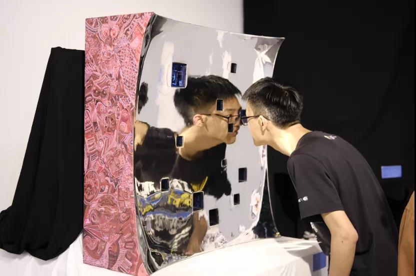 设计说明:作品意在探讨一种“镜像关系”,主体部分是由镜面和多条灯带构成的一个新媒体互动装置,由此呈现出一个向内无限延伸的镜内空间:在一个蓝色的密闭空间内获得沉浸式的体验,让人在观赏中开始思考,从而获得一种深层次的体验感及启迪。