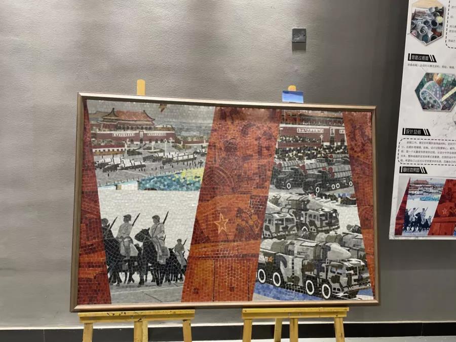 设计说明:这是一件以马赛克为创作原料的马赛克拼接装饰画,画的主题为“蜕变”,整件装饰画以4个不同时期的阅兵仪式画面,合适配色的马赛克原料,剪贴形成马赛克拼图。也想以数千块的马赛克拼接画面这一想法表达新中国成立以来的点点滴滴,风风雨雨,献礼党的百年寿辰。