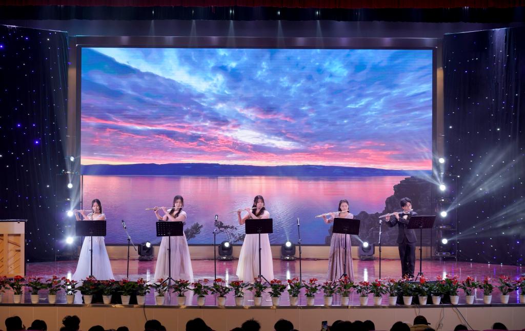 音乐会在民乐合奏《京调》中欢乐开场,将京剧曲调的韵味与民乐的独特魅力完美融合,瞬间点燃了现场气氛。随后的《阿里山之歌》又将观众带入了台湾地区那风光旖旎的阿里山,清新的旋律如微风拂面,让人仿佛置身于美丽的宝岛。小提琴二重奏《帕萨卡利亚》(亨德尔)时而低回婉转,时而高亢激昂展现了西洋古典音乐的深邃与优雅。二胡齐奏《葡萄熟了》《良宵》使听众们在欢快活泼舒缓悠扬的气氛之中流转。大提琴齐奏《大鱼海棠》和《穿越时空的思念》的旋律深沉醇厚,带领观众们亲临奇幻与感动的世界。古筝合奏《茉莉花》《市集》的旋律时而清新优雅时而灵动,让人如痴如醉。观众们在《贝加尔湖畔》的旋律中,感受贝加尔湖的神秘与宁静《贝多芬小提琴协奏曲》第三乐章OP.61展现出贝多芬音乐中不屈的精神力量,赢得观众阵阵喝彩。《扬鞭催马运粮忙》《姑苏行》分别展现了欢快喜庆如诗如画的景象。管乐合奏《茉莉花》别出心裁,《梁祝・化蝶》悠扬的琴声让听众为梁祝的爱情动容。音乐会在男女声二重唱《乘风破浪再出发》中圆满落幕歌声里饱含着对未来的憧憬与奋进的力量,激励着在场师生向着梦想勇往直前乘风破浪